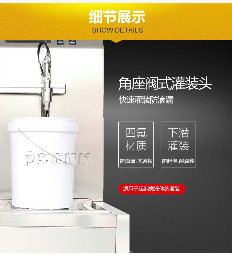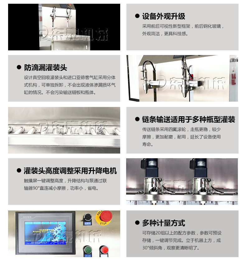2:半自動(dòng)油脂灌裝機(jī)采用手動(dòng)上瓶單速控制灌裝流速,勻速灌裝,使用氣動(dòng)內(nèi)封閉式灌裝閥嘴可有效防止灌裝過(guò)程的滴漏;