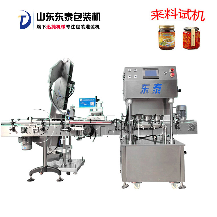 該直線式真空旋蓋機(jī)是東泰機(jī)械結(jié)合用戶使用情況,摒棄了傳統(tǒng)轉(zhuǎn)盤式真空旋蓋機(jī)的弊端,研制開發(fā)的新型高效設(shè)備,設(shè)備自動檢測到兩個瓶子蓋子進(jìn)入到雙頭真空旋蓋機(jī)內(nèi),旋蓋機(jī)彩色顯示屏?xí)?shí)時顯示旋蓋狀況,整機(jī)多點(diǎn)檢測,當(dāng)進(jìn)口無瓶無蓋、出口堵塞、定位不準(zhǔn)、瓶身傾倒均自動停機(jī)。單個旋蓋頭達(dá)到的真空度都可以單獨(dú)顯示,單獨(dú)調(diào)整。合格