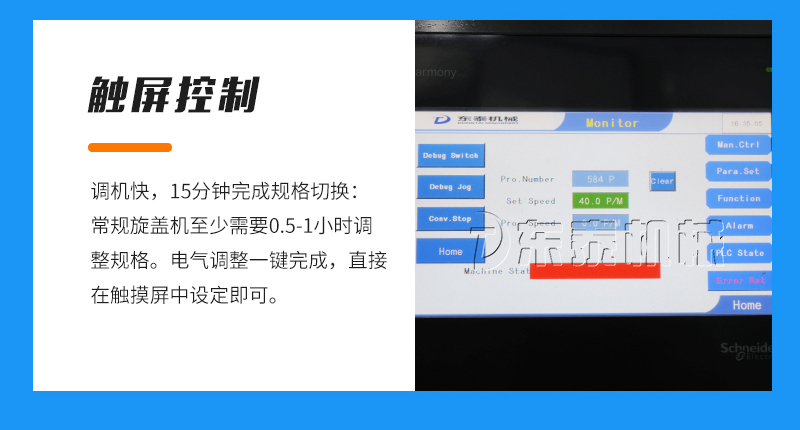 7、調(diào)機(jī)快,15分鐘完成規(guī)格切換:常規(guī)旋蓋機(jī)至少需要0.5-1小時(shí)調(diào)整規(guī)格。