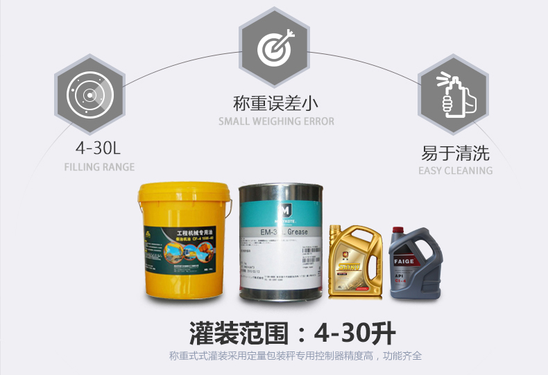 機油灌裝機適用于對4kg-25kg汽車用品類產(chǎn)品:潤滑油、防凍液、車用尿素等液體灌裝。自動完成計數(shù)進瓶、計重量灌裝、輸送出瓶等一系列操作。 特別適用于潤滑油、水劑、食用油的定量灌裝,是食品,醫(yī)藥,化妝品以及精細化工等行業(yè)的理想灌裝機。本機采用可編程控制器(PLC)、高速工控組態(tài)軟件進行實時監(jiān)控的控制,使用調(diào)節(jié)方便。整機按GMP標準要求制作,各管路連接采用快裝方式,拆卸清洗方便,與物料接觸部位及外露部位均采用不銹鋼制造。整機安全、環(huán)保、安全、美觀、能適應各種不同環(huán)境工作。